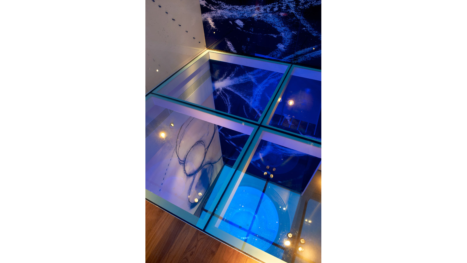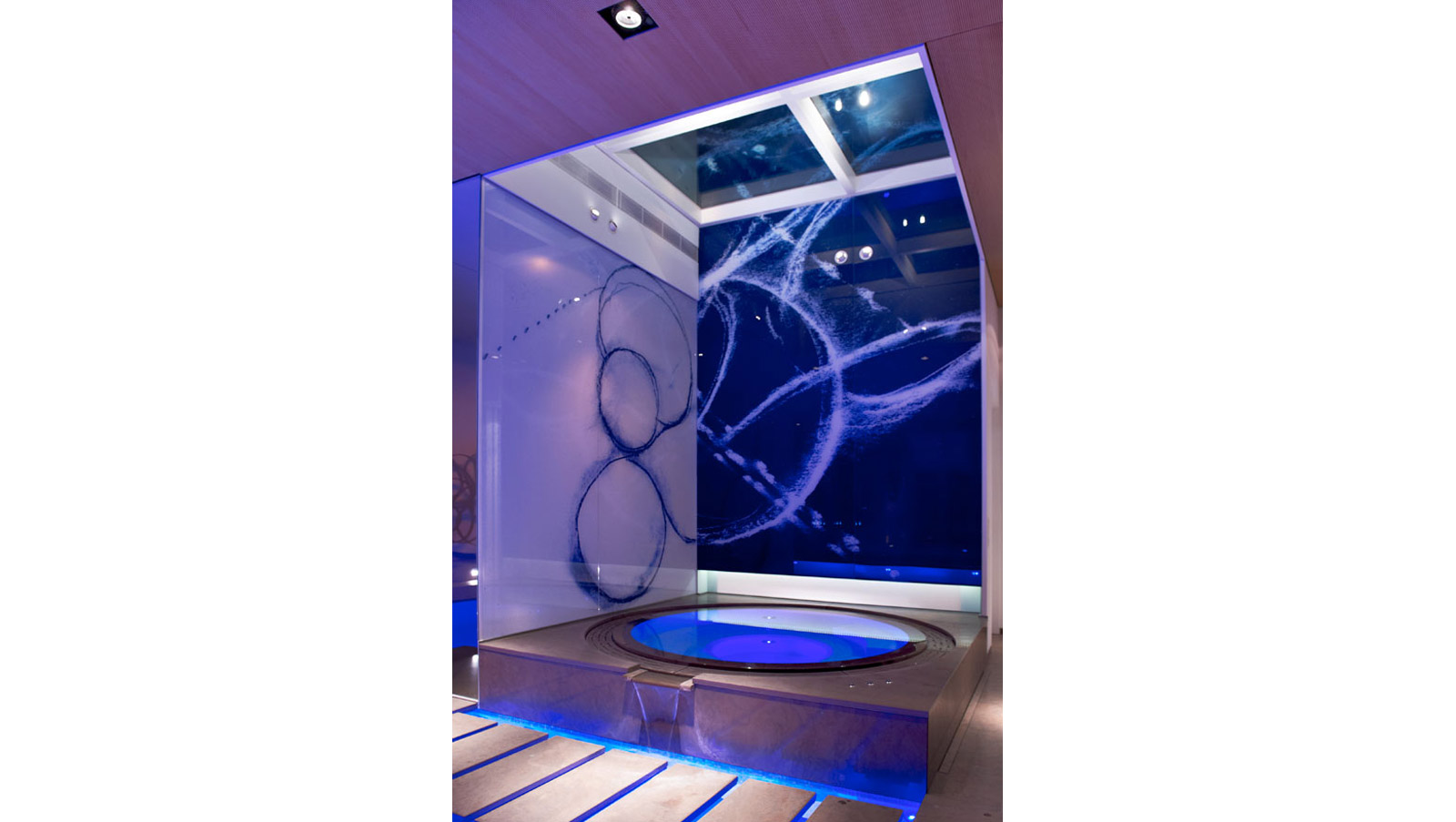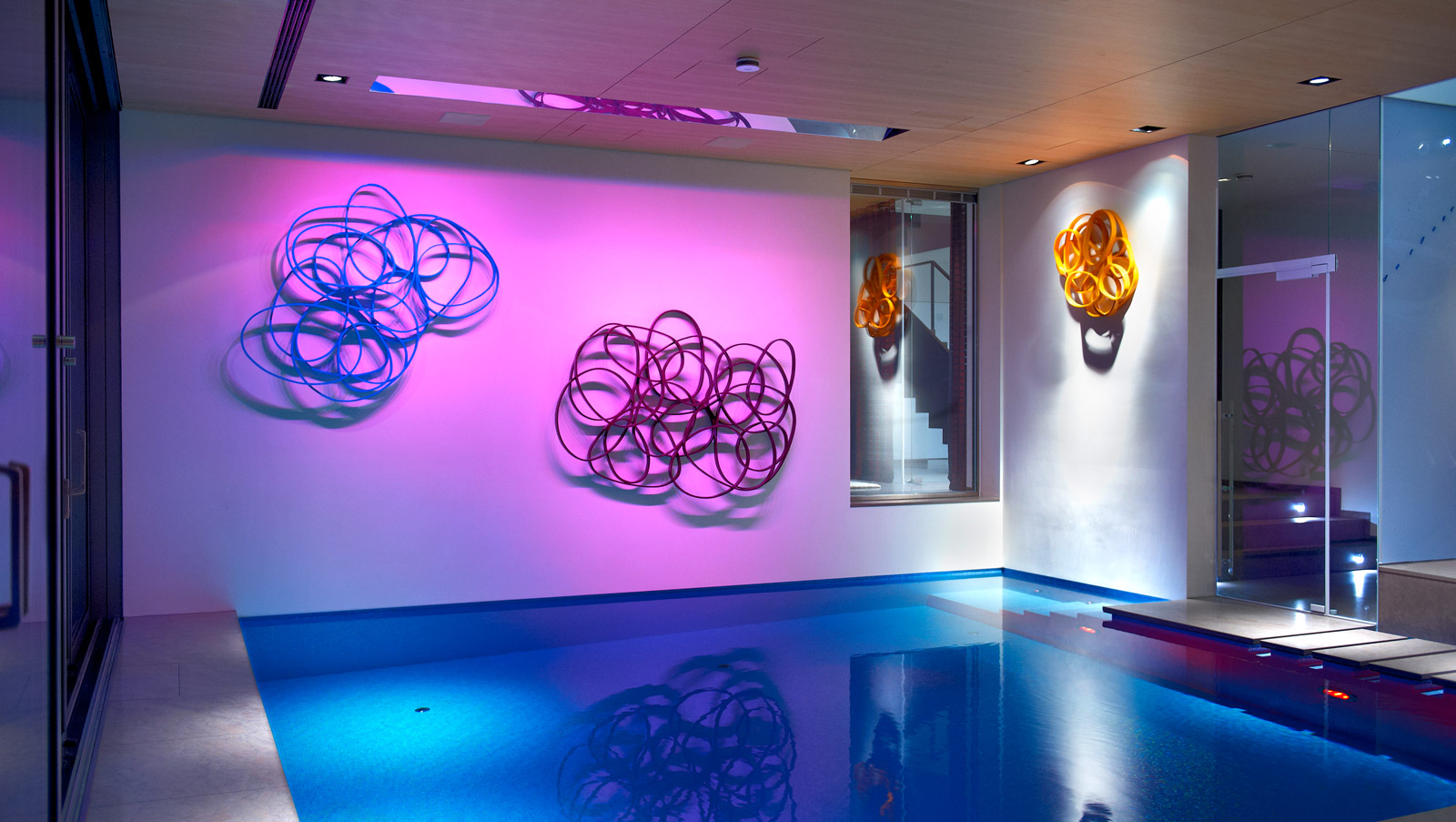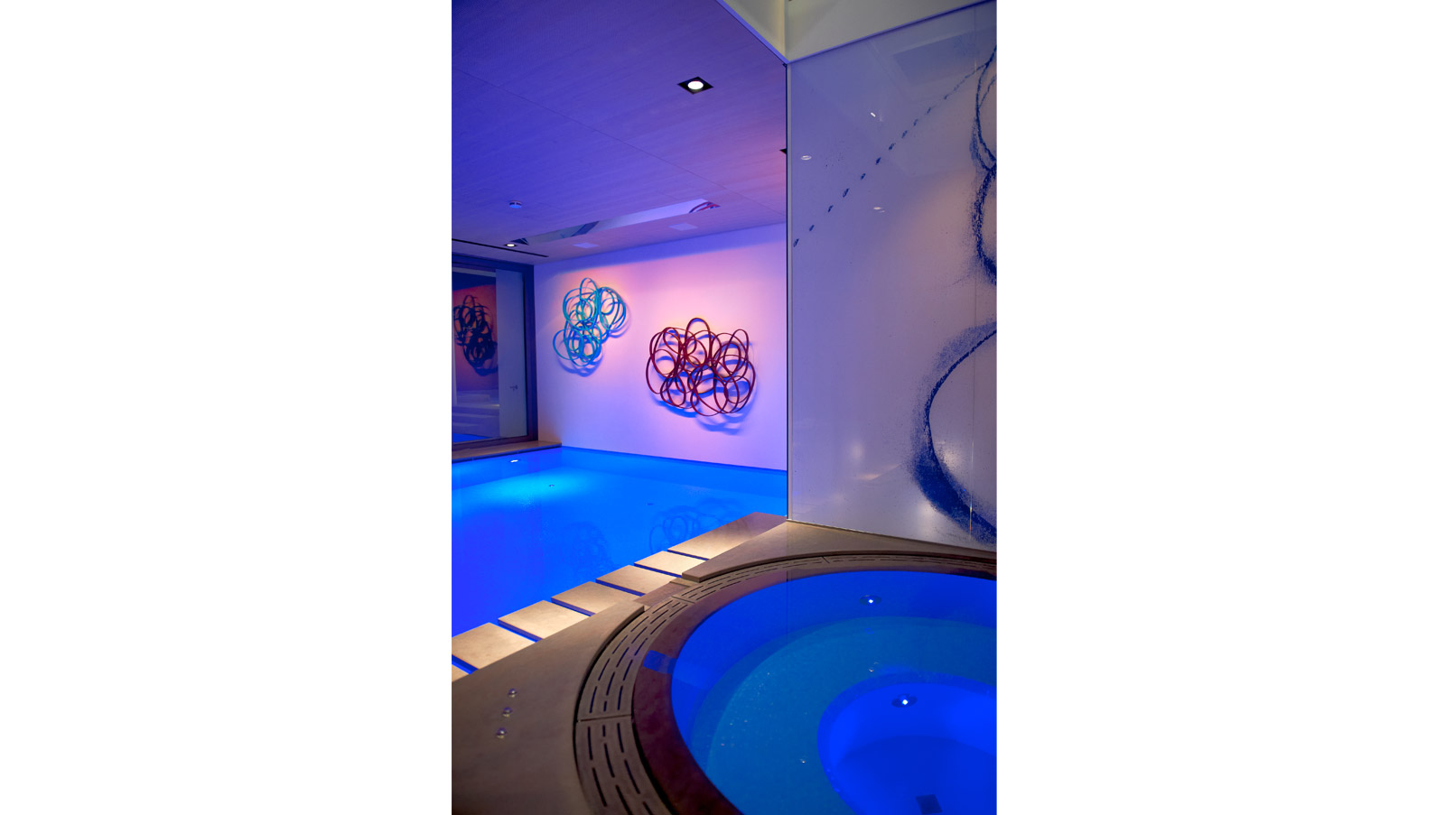 LED - RGB Strahler in der Decke und im Pool tauchen die Wasserfläche und die Schwimmhalle in faszinierende Lichtstimmungen und sorgen für eine ansprechende Atmosphäre. Die Synchronität der Leuchten im Pool und im Raum hat vor allem die Aufgabe, die dreidimensionalen Kunstwerke farbdynamisch in Szene zu setzen. Der Whirlpool als erhöhte Insellösung mit effektvollen Wasserfall in den Pool bietet höchsten Genuss und Entspannung.